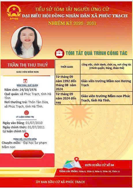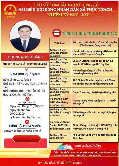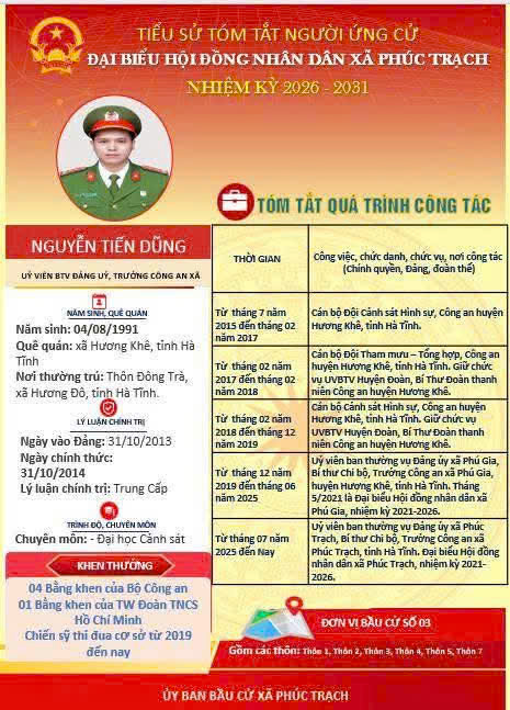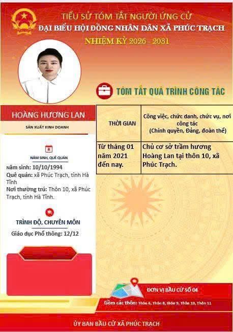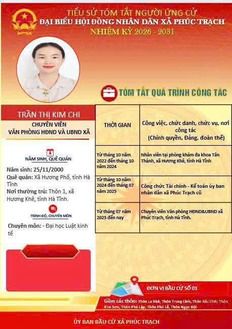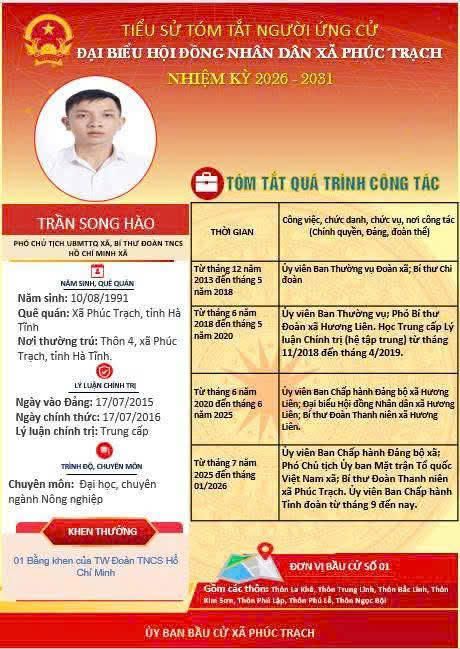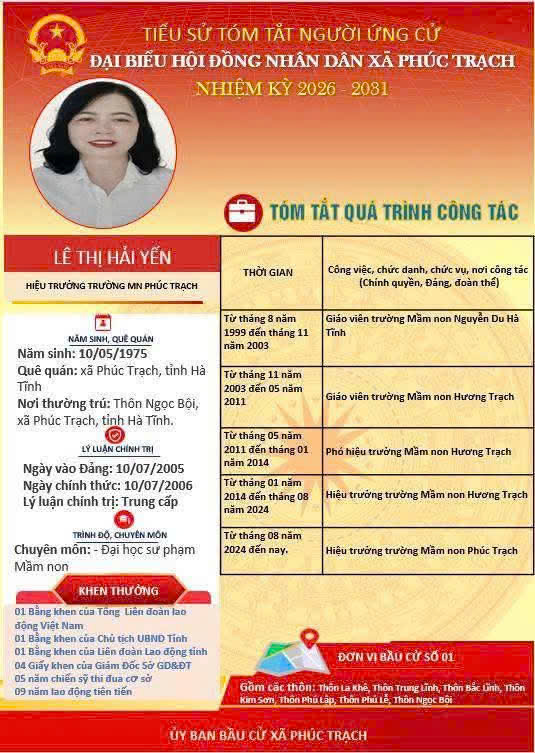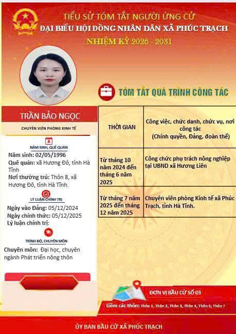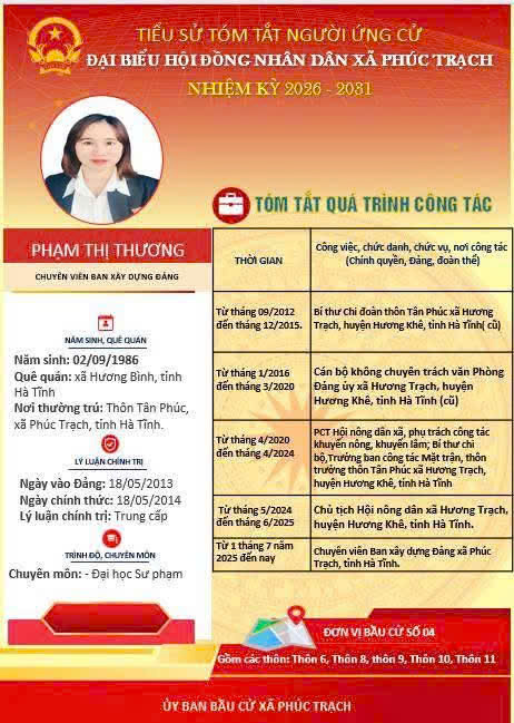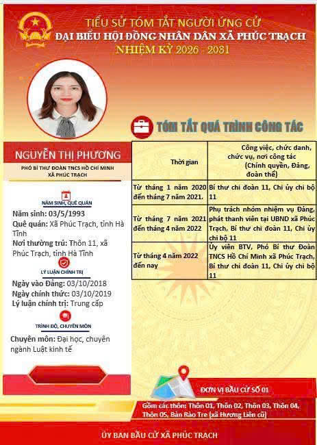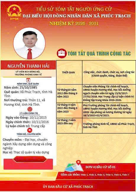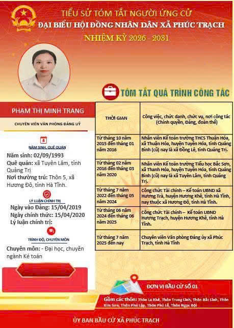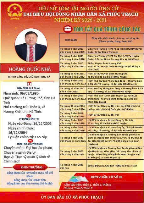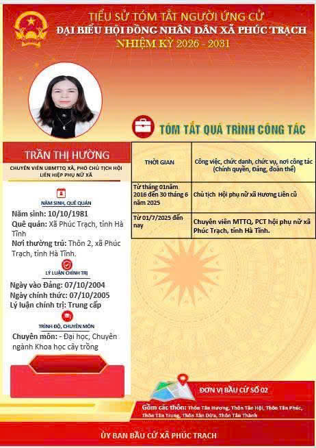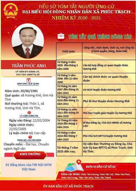 Các ứng cử viên đại biểu HĐND xã Phúc Trạch nhiệm kỳ 2026 – 2031 là những cán bộ, đảng viên và đại diện các tầng lớp Nhân dân trên địa bàn xã; có phẩm chất đạo đức tốt, năng lực, tinh thần trách nhiệm cao và tâm huyết với sự phát triển của quê hương. Nhiều đồng chí đã và đang đảm nhiệm các vị trí công tác quan trọng trong hệ thống chính trị, tích cực tham gia các phong trào thi đua yêu nước, xây dựng nông thôn mới, phát triển kinh tế - xã hội tại địa phương. Với chương trình hành động cụ thể, các ứng cử viên thể hiện quyết tâm lắng nghe, phản ánh trung thực ý kiến cử tri, góp phần xây dựng xã Phúc Trạch ngày càng phát triển, văn minh, giàu đẹp. Rất mong cử tri quan tâm, tìm hiểu và sáng suốt lựa chọn những đại biểu xứng đáng!