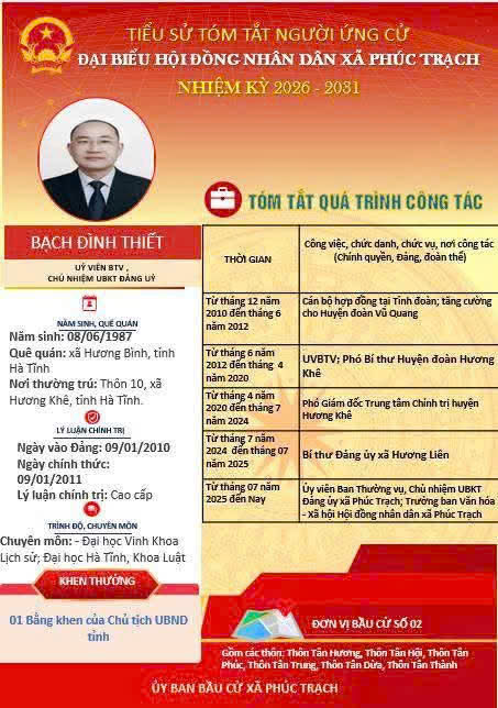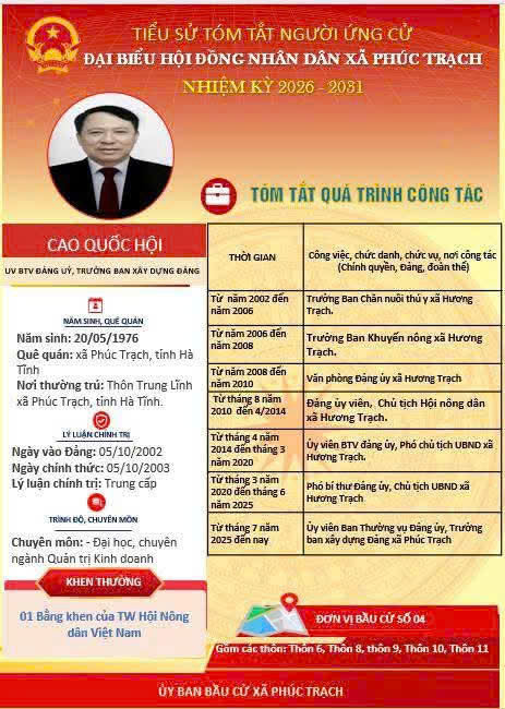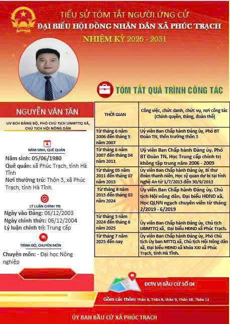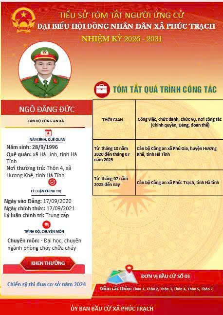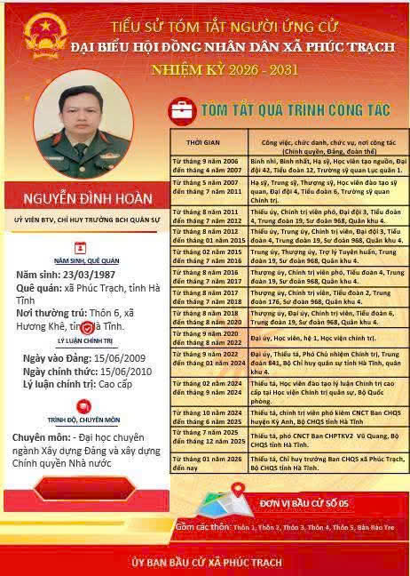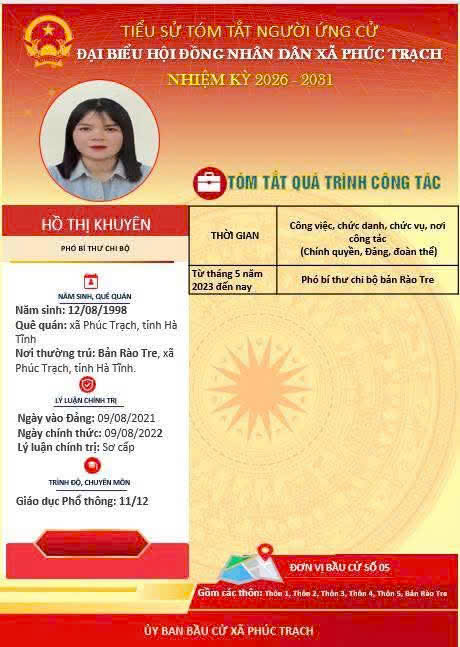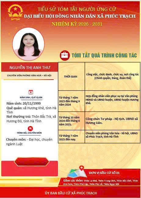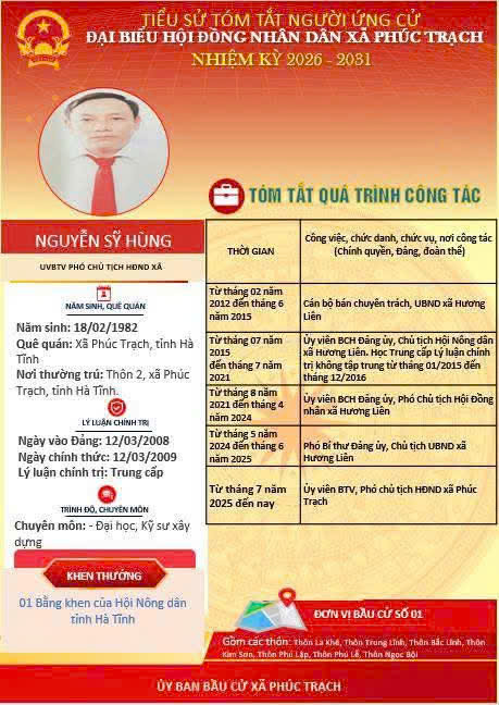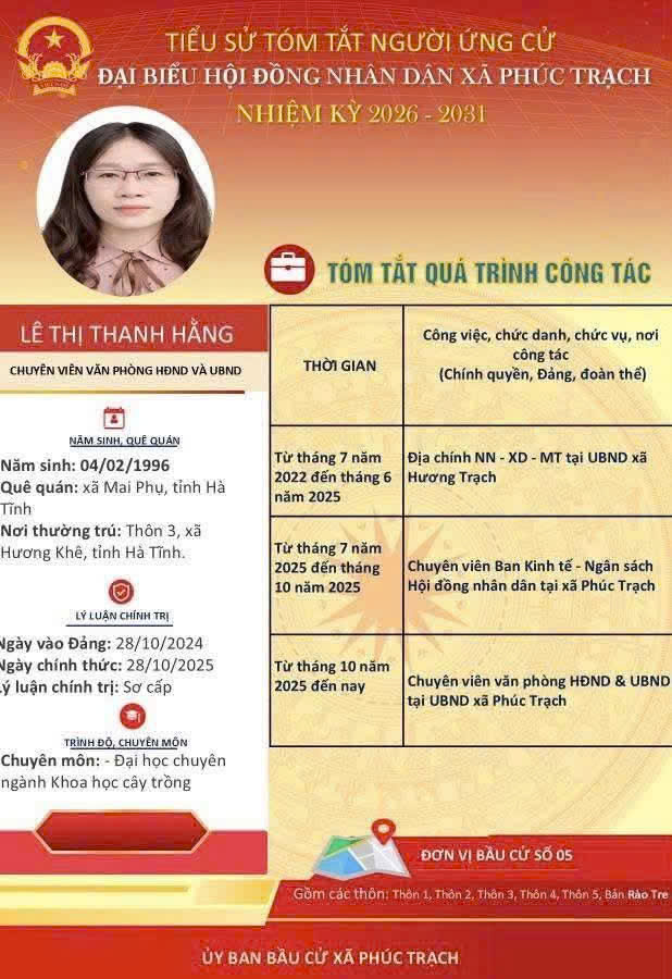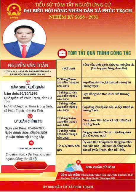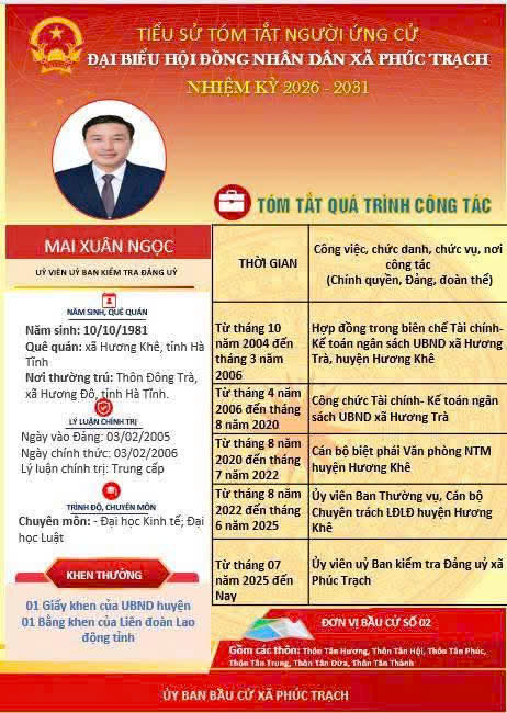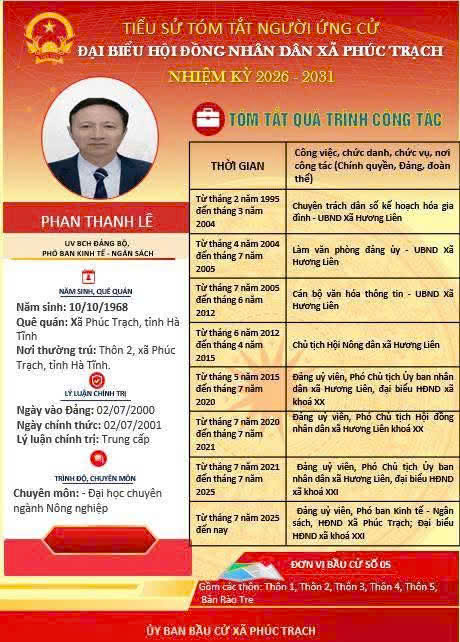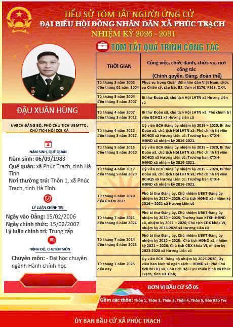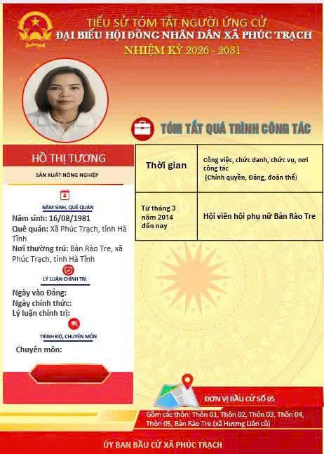 Các ứng cử viên đại biểu HĐND xã Phúc Trạch nhiệm kỳ 2026 – 2031 là những cán bộ, đảng viên và đại diện các tầng lớp Nhân dân trên địa bàn xã; có phẩm chất đạo đức tốt, năng lực, tinh thần trách nhiệm cao và tâm huyết với sự phát triển của quê hương. Nhiều đồng chí đã và đang đảm nhiệm các vị trí công tác quan trọng trong hệ thống chính trị, tích cực tham gia các phong trào thi đua yêu nước, xây dựng nông thôn mới, phát triển kinh tế - xã hội tại địa phương. Với chương trình hành động cụ thể, các ứng cử viên thể hiện quyết tâm lắng nghe, phản ánh trung thực ý kiến cử tri, góp phần xây dựng xã Phúc Trạch ngày càng phát triển, văn minh, giàu đẹp. Rất mong cử tri quan tâm, tìm hiểu và sáng suốt lựa chọn những đại biểu xứng đáng!