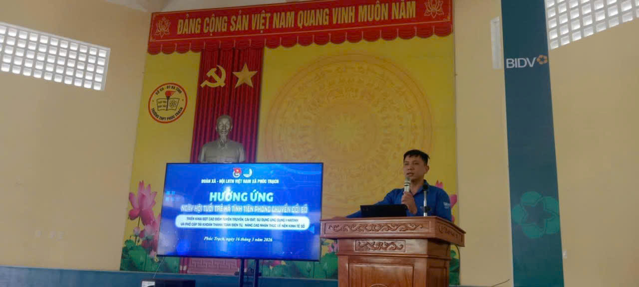 Thiết thực chào mừng kỷ niệm 95 năm Ngày thành lập Đoàn TNCS Hồ Chí Minh (26/3/1931 - 26/3/2026), chiều ngày 16/3/2026, tại Nhà văn hoá xã, Nhà đa chức năng trường THPT Phúc Trạch. Đoàn xã Phúc Trạch tổ chức chương trình hưởng ứng Ngày hội Tuổi trẻ Hà Tĩnh tiên phong chuyển đổi số. Tại chương trình, đoàn viên thanh niên được tuyên truyền, hướng dẫn cài đặt và sử dụng ứng dụng (i-Hà Tĩnh),tích hợp nền tảng phản ánh hiện trường tỉnh Hà Tĩnh, giúp tiếp cận các tiện ích của chính quyền số, đồng thời triển khai đợt cao điểm phổ cập tài khoản thanh toán điện tử, thanh toán không dùng tiền mặt. Bên cạnh đó, hoạt động cũng góp phần nâng cao nhận thức về chuyển đổi số, kinh tế số và xã hội số, khuyến khích đoàn viên, thanh niên phát huy vai trò tiên phong ứng dụng công nghệ trong học tập và đời sống. Thông qua chương trình, tuổi trẻ xã Phúc Trạch tiếp tục khẳng định vai trò xung kích, sáng tạo trong công cuộc chuyển đổi số, góp phần xây dựng quê hương ngày càng phát triển, hiện đại.