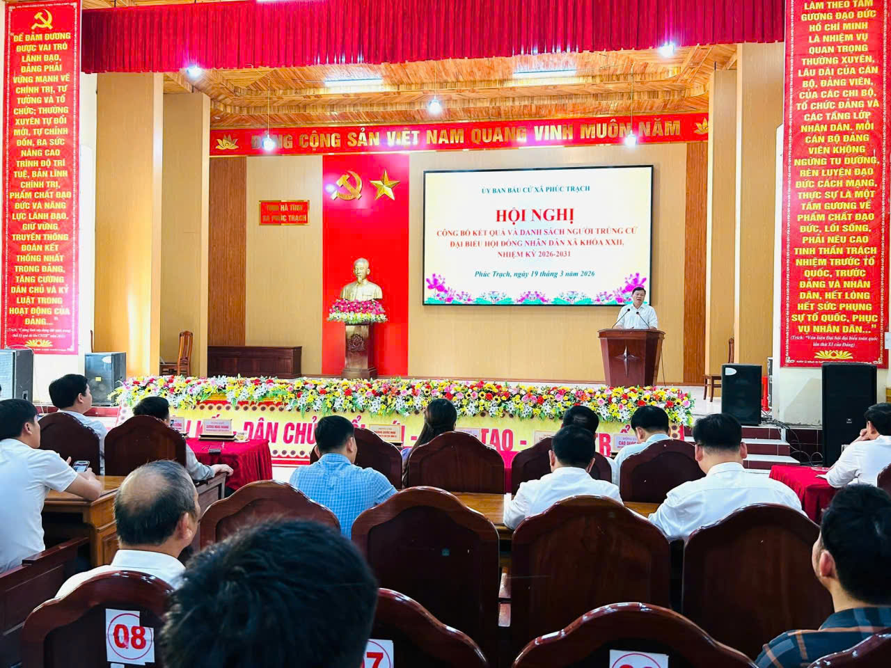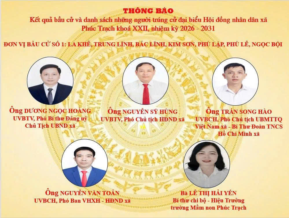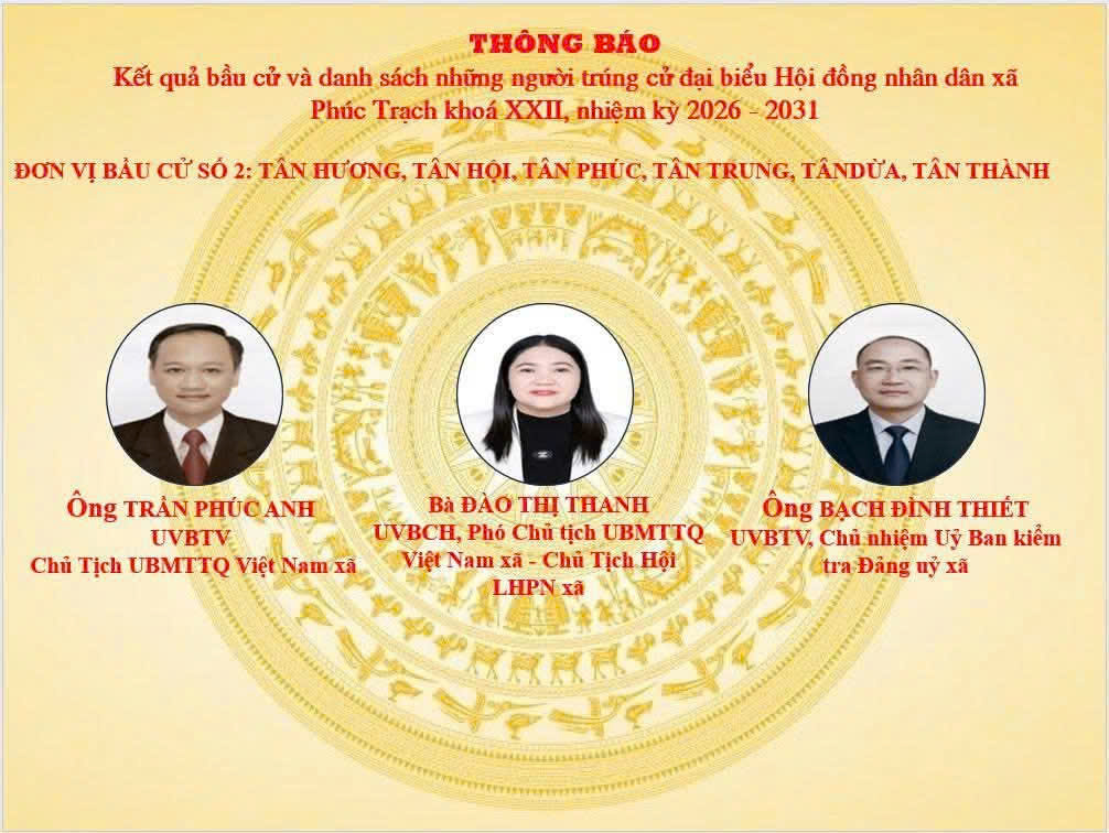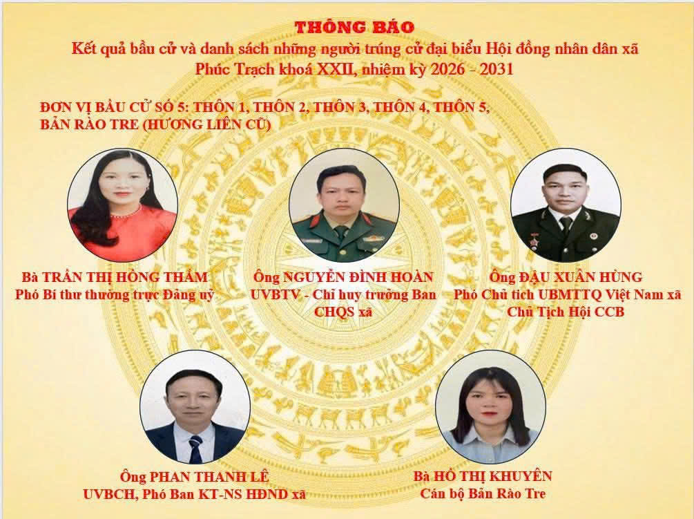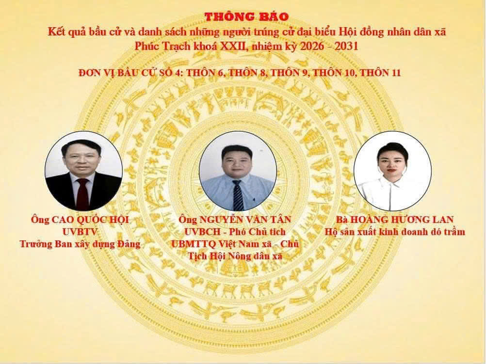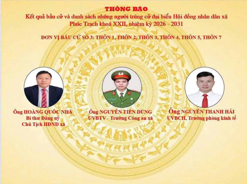 Sáng ngày 19/3/2026, Ủy ban bầu cử xã Phúc Trạch tổ chức Hội nghị công bố kết quả bầu cử và danh sách những người trúng cử đại biểu Hội đồng nhân dân xã khóa XXII, nhiệm kỳ 2026–2031. Tham dự hội nghị có các đồng chí trong Thường trực Đảng ủy, các đồng chí Ủy viên Ban Thường vụ, Ban Chấp hành Đảng bộ xã; Ban chỉ đạo bầu cử; Ủy ban bầu cử xã; đại diện các ban, ngành, đoàn thể; cùng các đại biểu trúng cử HĐND xã nhiệm kỳ mới.